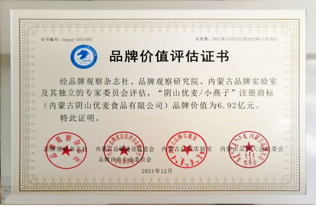 大會(huì)還發(fā)布了2021年度“內(nèi)蒙古百強(qiáng)品牌價(jià)值評(píng)估報(bào)告”,經(jīng)權(quán)威機(jī)構(gòu)及專家委員會(huì)評(píng)估,陰山優(yōu)麥品牌價(jià)值為6.92億元。